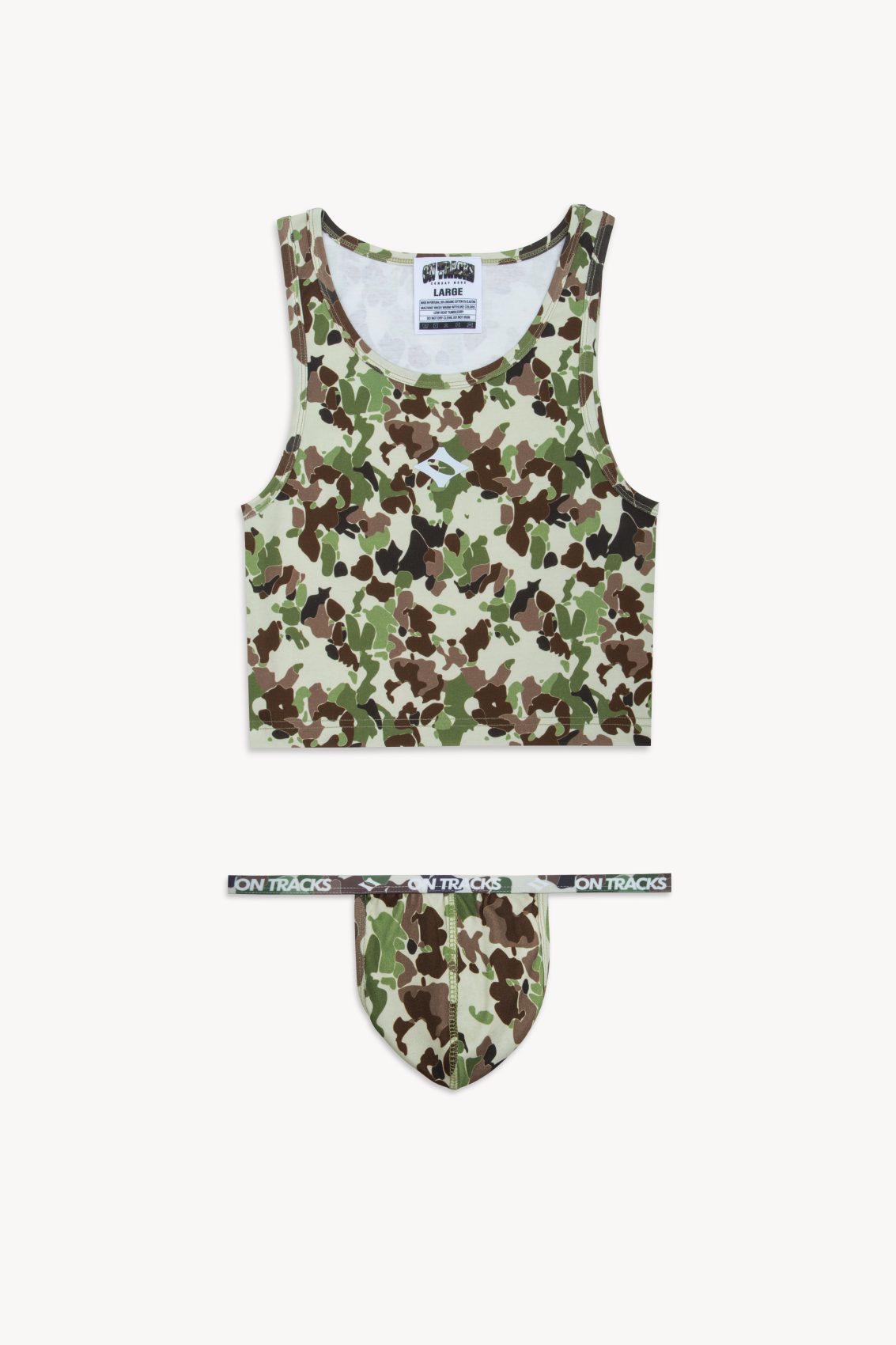 INTERLOCK cotton crop tank top with front logo, paired with the iconic ONTRACKS THONG. Made in Portugal with a colse, comfortable fit.