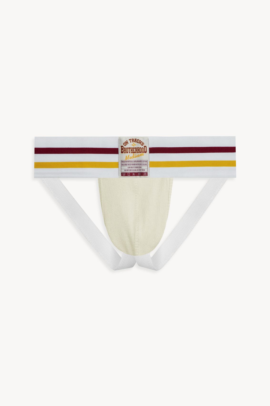 Athletic ribbed jockstrap with a varsity-striped waistband and the Brotherhood emblem up front. Features a supportive ribbed pouch and an open-back cut built for movement and everyday wear. Made in soft, durable ribbed cotton.