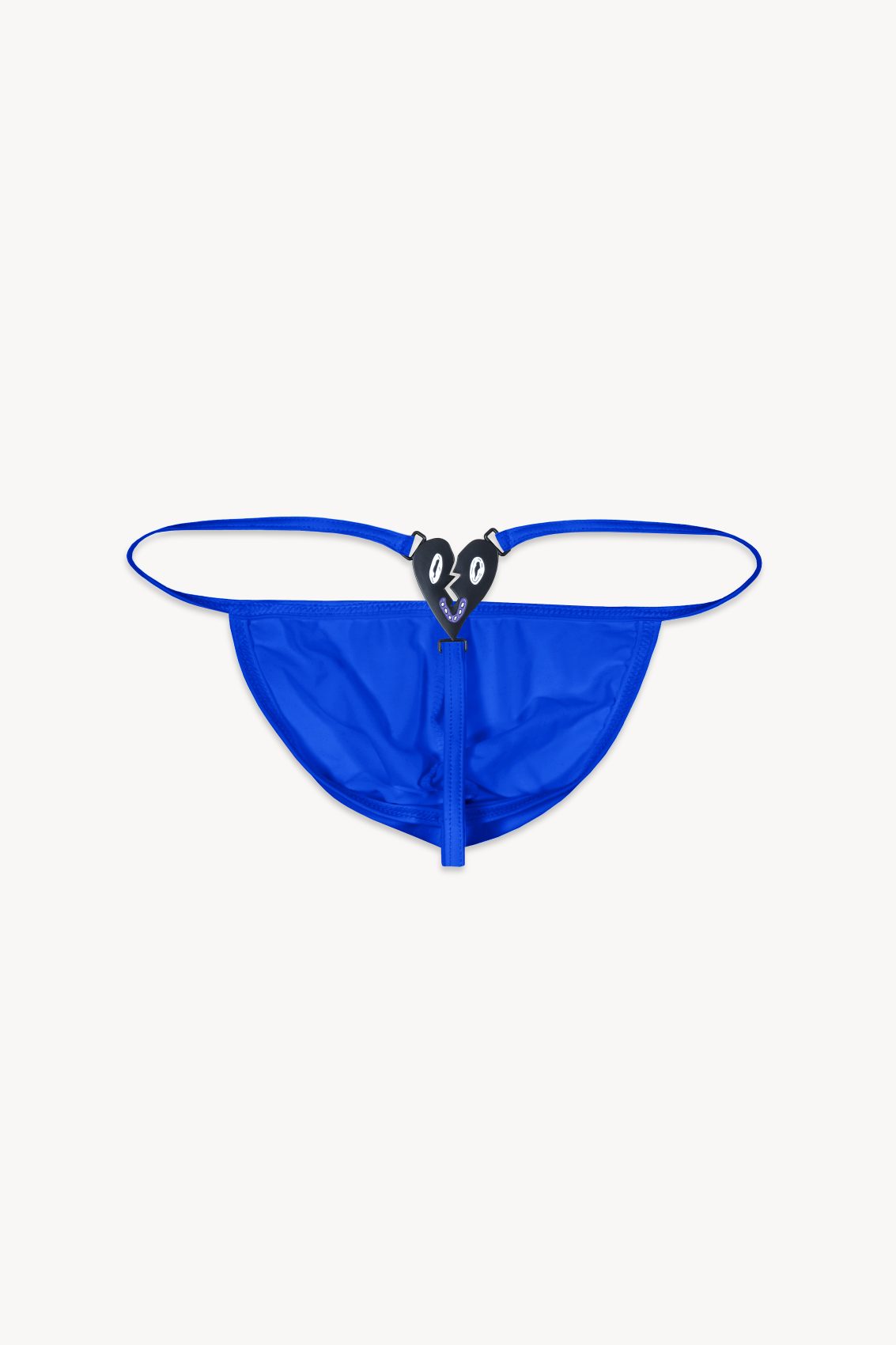Our iconic buckle thong now with an exclusive Pepo Moreno buckle “broken heart” design. Made with klein blue Econyl, a first quality Italian recycled nylon fabric.