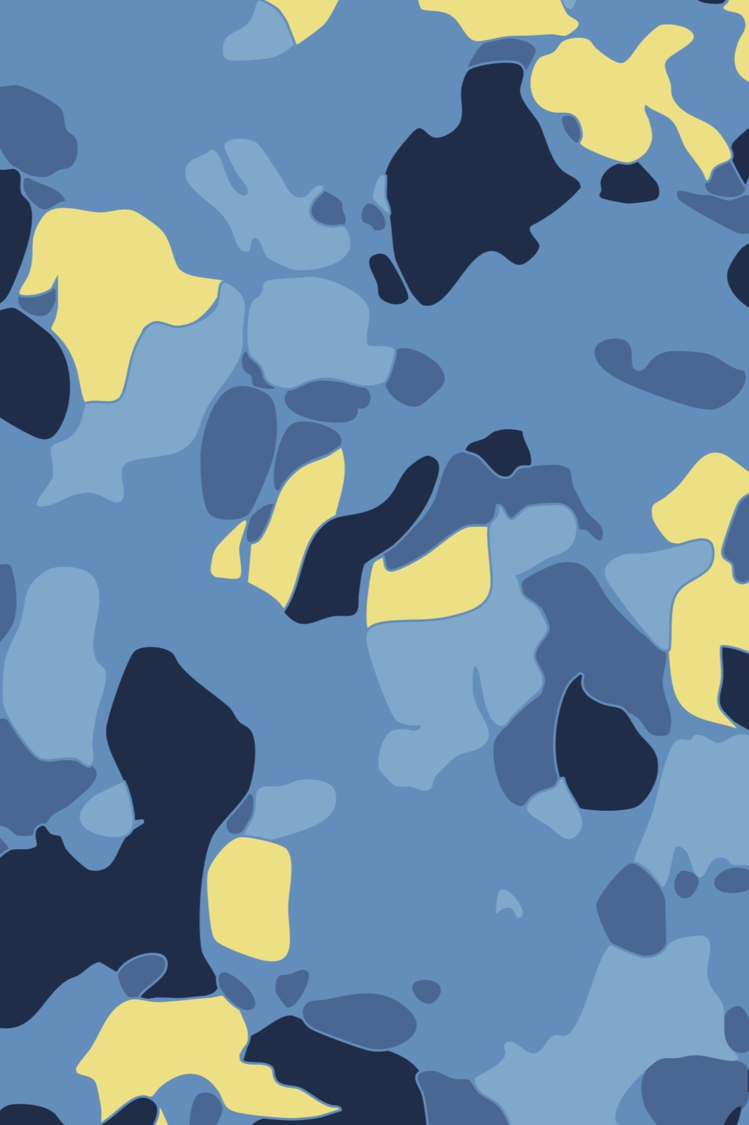 Vivid camouflage print with organic shapes in sky blue, navy, and bright yellow. A fresh, dynamic update to classic camo.