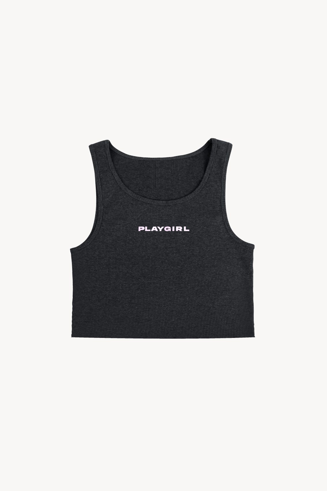 Fitted ribbed crop tank with PLAYGIRL print on chest. OT X PG logo on the back. Made in Portugal. Wear it under, over or alone.